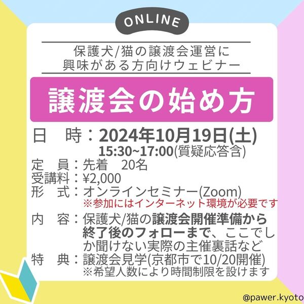 | イベント内容 | オンラインセミナー「譲渡会の始め方」を開催します。 ご希望の方は、以下まで空メールをお送りください。 pawer.volunteer.gmail.com ◆基本情報 日時: 2024/10/19(土) 15:30-17:00 定員: 先着20名 対象: 譲渡会運営に興味がある方や、 出る側として譲渡会の仕組みを知りたい方など! オンラインセミナーのため、どこからでも参加可能! ※開催場所はオンラインです 譲渡会の開催方法に関するセミナーは あまりない機会!ですので、ぜひご参加下さい? |