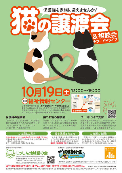 | イベント内容 | 10月19日(土)に「猫の譲渡会&相談会」を開催いたします。 保護猫を迎えたい方はもちろん、猫に関する相談会も同時開催しております。 ご近所との猫トラブルなどでお悩みの方も、どうぞお気軽にお立ち寄りください。 地域貢献の一環として、フードドライブの受付もしております。 ご家庭や職場で余っている食品がありましたらぜひお持ちください! 小さな譲渡会ですが、猫さんも人間も良いご縁を紡げられるよう、のんびり続けています。 遊びにきてくださいね(*^^*) 【日時】10月19日(土)13:00〜15:00 【会場】福祉情報センター ★★★ご注意★★★ 会場は「中央福祉センター」の中ではありません。 その隣の奥まったところにある「福祉情報センター」という小さな建物で開催しております。 お手数ですが、チラシやホームページの地図をご確認の上お越しください。 ★★★★★★★★★ 【入場無料・予約不要】 【主催】にっしん地域猫の会 【ホームページ】https://nissinchiikineko.main.jp ※会場前に駐車場がございますが、数が少ないため、満車時は中央福祉センターの駐車場をご利用ください。図書館のむかいにある市役所の臨時駐車場もご利用いただけます。 ※室内換気のため冷暖房が効きにくい場合がございます。 ※ペット同伴のご入場はできません。 ※猫ちゃんの譲渡には条件がございます。詳細はホームページをご参照ください。 |
