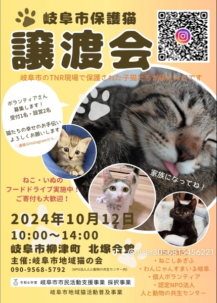 | イベント内容 | 岐阜市内のTNR現場で保護された子猫たちの譲渡会です。 ハンデのある子もいますが、可愛い子達です。 よく慣れてる子、怖がりな子 色んな子がいます。 是非、逢いに来てあげてください。 入場無料 当日、連れて帰ることは出来ません。 医療費の一部のご負担をお願いしております。 チャリティーバザーも開催します。 売上は保護猫活動に寄付されます。 |