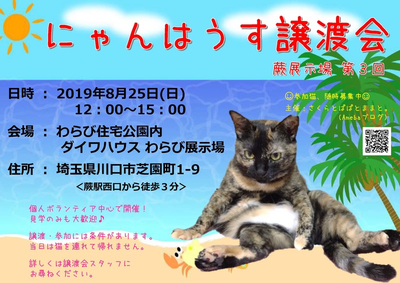 | イベント内容 | 個人ボランティアによる保護ねこ譲渡会です♪ ・JR京浜東北線 蕨駅西口より 徒歩3分 ・場内に駐車場あり 綺麗な住宅展示場室内でのステキな譲渡会です˖✧✧˖° たくさんの猫たちが家族を探してます。 ※猫は当日は連れて帰れません。 アンケートに記入していただき、飼育環境などのお話をさせて頂いたのち、 ご自宅まで伺いトライアルを経てからの正式譲渡となります。 詳しくは下記のブログをご覧ください。 https://ameblo.jp/ayacha-ya/ |
