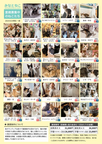 | イベント内容 | みなとねこが毎月定期開催している譲渡会です 白金は小規模アットホームな会場です 2024年も譲渡会を通じて289匹もの猫を161家庭にご縁を繋ぐことができました ご予約はみなとねこのHPよりお願いします https://www.minatoneco.com/event 参加猫の詳細はこちら https://www.minatoneco.com/gallery 参加猫たちの様子はYoutubeのみなとねこチャンネルもご覧ください https://youtube.com/playlist?list=PLRxhCqU-Dt77IaUtZCDeratPPI7Jek6ZL ーーー 会場は白金高輪駅3分のカフェバーです。入場の混雑を避けるために20分毎に予約受付をしております。近くにはセブンイレブンやマツキヨ、メゾンカイザー本店などがありますのでお買い物しながらお待ちください。 10ケージ 20匹ほどの参加となりますが、それ以外の預かり宅の猫もご紹介可能です。 ※通常は20ケージ50匹以上の大規模な譲渡会を行っています。たくさん見てみたい方は10/26(土)芝浦会場をご検討ください。 子猫は2匹ペアでの譲渡が原則です 初めての方こそ最初から2匹をお勧めしています また私たちボランティアは、ご縁のあった猫たちに終生里親様に愛されて幸せに安全に暮らして欲しいと願っています このため里親になっていただくにはいくつかの条件やお約束事があります。 ◆基本条件(猫それぞれ、保護主により異なります) ・ご家族全員が飼育に賛成であること ・ペット可物件での完全室内飼い、エアコンなどによる室温管理、医師の指示に従い定期的な受診やワクチン接種、 適切な時期(生後4ヶ月中)での避妊去勢、病気予防に配慮したフードの選択、終生飼養をお願いしております。 ・ケージのみの飼育、リビング以外の一室のみでの飼育は不可です。十分な運動のスペースと窓から景色が眺められのんびり日向ぼっこが可能な環境が望ましいと考えています。 ・誤食などの事故防止のため、お部屋の整理整頓や脱走防止にも万全の対策をお願いします。 ・換気が十分でない室内での喫煙をされる方はお断りしております。 ・日々のお世話だけでなく、スキンシップが可能な精神的・時間的・経済的な余裕がある方に限らせていただきます。猫が20年以上生きる中でなるべく変わらぬ環境で愛情を注いで頂けるよう、家族構成やお仕事、お住まいに変化のない方を優先させていただきます。 またお届けやフォローの都合上、募集エリアも東京、神奈川、埼玉に限らせていただいております。 ■里親申込書類一式はみなとねこHPよりダウンロードをお願いします https://www.minatoneco.com/foster-entry 会場では里親申込書を拝見して簡単な面談を行います 会場にてご記入いただくことも可能ですが、面談希望の方が多いとお待ちいただくことになりますので、お手元で印刷していただきご記入の上ご来場いただくことをおすすめしております ※ご家族にアレルギーがある方、喫煙者がいる場合には是非事前にご相談ください ※猫と暮らしたことのない未就学児がいらっしゃる場合には事前にアレルギー検査などお勧めします 実際の参加予定猫 10/13(日)21:00までにみなとねこのHPやFacebookページでご紹介します https://m.facebook.com/minatoneco/ 直接ご応募の方は詳細をLINEなどでやりとりの上で預かり宅でのお見合いも行っております そうした中で譲渡会前に里親様が決定することもございますことご了承ください ※予約優先、混雑時は入れ替えや入場をお待ちいただくなどのご協力をお願いしております ※換気のためにドアをオープンしての開催のためにケージ越しでのご対面となりますことご理解ください ※譲渡会の開催や保護活動の継続のため、お一人様500円以上のご寄付をお願いしております |