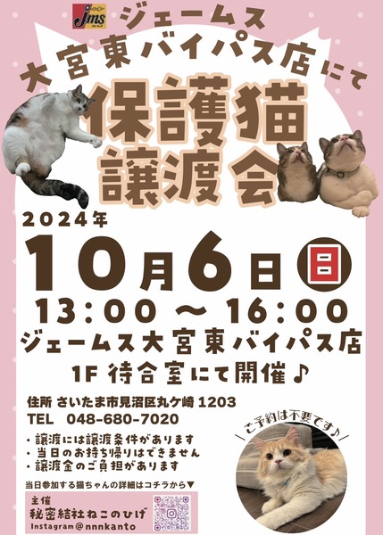 | イベント内容 | 10/6(日)13:00~16:00は♪ ジェームス大宮東バイパス店 〒337-0001 さいたま市見沼区丸ヶ崎1203 にて♪ 秘密結社ねこのひげ 保護猫譲渡会を開催します☆ カー用品を見に来たらば… 保護猫譲渡会をやっててビックリ! (⊙⊙)ファッ!? 車のメンテナンスに来たらば… 保護猫がいぱーーい♪で (*´Д`*)ハァハァ♡ 新しい家族を探しに来たらば… 出逢っちゃった♡ (o・ω[+]ロックオン!! などなど♪ お迎え目的の方はもちろんのこと そうでない方も!! 是非お気軽にお立ち寄りくださいませ☆ (ΦωΦ)ココロヨリオマチシテマース♡ ご不明な点がございましたら インスタグラム @nnnkanto 秘密結社ねこのひげ の DMまでお問い合わせ下さい☆ |