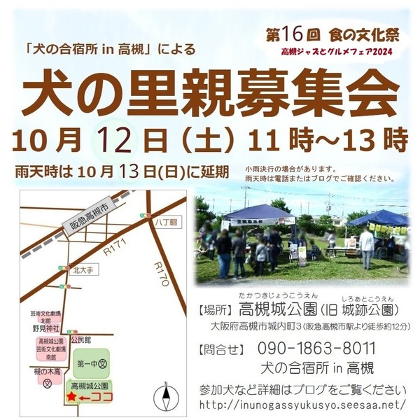 | イベント内容 | ※高槻食の文化祭との同時開催で、高槻城公園内で犬(と猫)の里親募集会を行います。 ※雨天時は10月13日(日)に延期。 (小雨決行の場合もあります。電話で確認頂く方が確実かと思います。) ※すべての犬が参加するわけではありません。 会いたい犬が決まっている方は事前にご確認下さい。 【お問合せ等は➡090-1863-8011】 ※先住犬も連れて来て頂けます。 ※「高槻食の文化祭」という大きなイベントの一角で行いますので、近隣のコインパーキングは混雑が予想されます。 公共交通機関のご利用を強くお勧めします。 ※ 参加犬については、「犬の合宿所in高槻」のブログまたは電話(090-1863-8011)で直前チェックをお願いします。 http://inunogassyukusyo.seesaa.net/article/505044220.html ※隣のテントで With Catさんが猫の譲渡会とフリマをされます。 猫好きの方に知らせてあげてくださいね。 →@withcat2022)(クリックするとWith Catさんのインスタグラムに飛びます) 【お問合せ・連絡先】 090-1863-8011 |