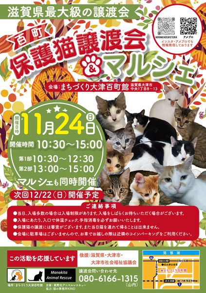 | イベント内容 | 滋賀県最大級の保護猫譲渡会。 毎回40頭以上の猫さんが参加します。 初めての方でも安心して譲渡の安心サポートの譲渡会です。 予約不要、入場無料。 参加猫さんのご紹介は https://ameblo.jp/hyakucyojyoutokai または、Instagram @hyakucyoujyotokai をご覧下さい。 ※ 後援 滋賀県、大津市、大津市社会福祉協議会 |