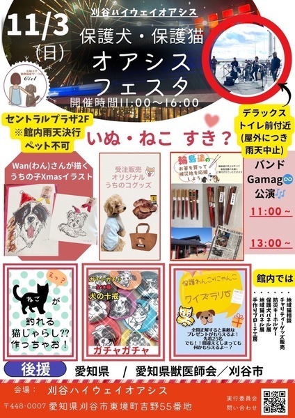 | イベント内容 | 【保護犬・保護猫オアシスフェスタ in刈谷ハイウェイオアシス】を開催いたします。 様々なイベントを予定しています。 https://www.instagram.com/p/DA0_5TdzoKv/?igsh=cjRpNnM0bTUyaHp2 お出かけに気持ちのいい季節です。 是非、ご家族みなさんで遊びに来てくださいね。 *ペット入場不可です SORA公式ホームページ https://sora-chiisana.org/foster/ SORA公式活動メインブログ https://ameblo.jp/sora-chiisana-inochi/ SORAイベントブログ https://ameblo.jp/sora-charity-events/ |