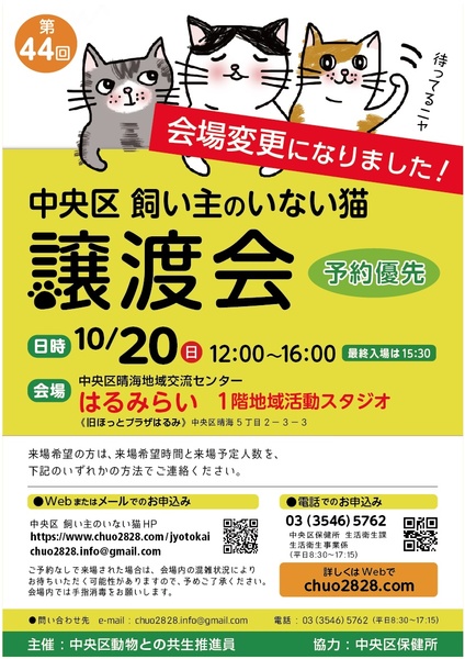 | イベント内容 | 【10/20(日)12:00-16:00】晴海の「はるみらい」で譲渡会を開催します。 ※これまでの月島会場が総選挙の影響で使えなくなり急遽会場を変更しました。 会場のケージ数に限りがありますので、事前にお問い合わせがあった猫を優先的に参加させたいと考えております。ご予約の際にご記入をお願いします。 会場:はるみらい(中央区晴海5-2-3) https://www.harumirai.jp/#accessAnc 勝どき駅A3出口徒歩15分 東京BRT新橋駅日本テレビ前より6分 ご予約はこちらから(各回30分) https://www.chuo2828.com/jyotokai からお願いします。 ※身分を証明できる物をご持参の上、出来るだけ同居のご家族皆さんで、ご予約の上お越しください。 ※中央区近郊の方を優先させていただきます。都内、埼玉、神奈川県内でも晴海・月島より車で30分以上の場合は保護主によってはお届けやフォローができないためにお断りする場合があります ▽他にもたくさんの猫が里親募集中です。 https://www.chuo2828.com/catslist ※1週間くらい前に参加猫が決まります |