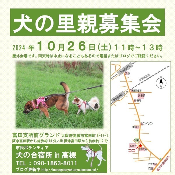 | イベント内容 | ※屋外会場での里親募集会です。雨天時は中止にする可能性がありますので電話でご確認ください。 犬によっては別会場をご案内できる場合があります。 (電話でのお問合せ→090-1863-8011) ※先住ワンちゃんを連れて会いに来て頂けます。相性を見るためにも、是非是非、連れてきてください。 ※近付きましたら「犬の合宿所in高槻」のブログでも参加予定犬等の情報を紹介していきます。 http://inunogassyukusyo.seesaa.net/article/505171330.html 予約は不要ですが、参加犬が直前に変更する場合がありますので、特に会いたいワンちゃんが決まっている場合は事前にご確認頂く方が確実かと思います。 【お問合せ】 090-1863-8011 ・・・・・・・・・・ 【アクセス】 ・阪急京都線 富田駅から徒歩約10分 ・JR京都線 摂津富田駅から徒歩約12分 ※隣接する富田支所と公民館の駐車場は使えませんが、会場広場内に駐車できる場合があります。 事前にご確認ください。(090-1863-8011) ・・・・・・・・・・ 市民ボランティア「犬の合宿所in高槻」は、現地での譲渡が難しい離島の保健所収容犬を引き取り関西で新しい飼い主探しをしています。 保護犬を家族として迎えることが文化として定着し、生体販売に伴う悲惨な繁殖犬の存在がなくなることを願っています。 ・・・・・・・・・・・・・・・・・・・・・・・・・・・・・ ★ 一時預かりさんや犬の搬送ボランティアさん、里親募集会の当日お手伝いの方など常時募集しています。 ★犬によっては個別お見合いできる場合があります。 里親募集会に参加できない方で個別お見合いをご希望の方は、預かりさんとの日程調整が必要ですので、電話でお問合せください。⇒090-1863-8011 |