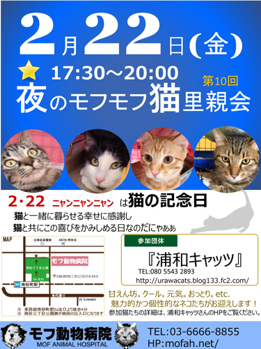 | イベント内容 | 2月22日(金)江東区南砂のモフ動物病院さんにて「第10回モフモフ猫里親会」子猫から中猫から成猫迄沢山の猫達が参加します モフ動物病院さんで初めての夜の譲渡会です 日時 2/22(金)17:30〜20:00 会場 モフ動物病院(江東区南砂3-13-5 ☎03-6666-8855) アクセス 東西線南砂町駅2a出口より徒歩4分(南砂三丁目公園側が病院の入り口になります) 参加団体 浦和キャッツ 病院内での猫里親会です。お医者様もいてくださいますのでご質問等も出来ます。 室内での開催なのでゆっくりと猫と触れ合って頂けます。 子猫から中猫から成猫さんまでいろいろな世代の子達が沢山参加予定です。 ぜひ足をお運び下さい。 譲渡にはお願いごとがございます。譲渡条件をご確認下さい。 浦和キャッツ「http://urawacats.blog133.fc2.com/」をご覧下さい。 参加猫達は 浦和キャッツ http://urawacats.blog133.fc2.com/ または 翔べ!しっぽの猫たち https://ameblo.jp/shippocats-ganba2016/ をご覧ください。 不幸な犬や猫が沢山います。 浦和キャッツは猫の保護活動をしていますが助けられる猫はほんの少し。 なんとか保護出来た子はみんな幸せへと送り出したいと強く思い活動しています。 猫と暮らしたいと思われましたらぜひ保護猫を家族に迎えて頂けます様に。 |