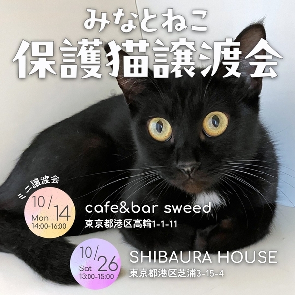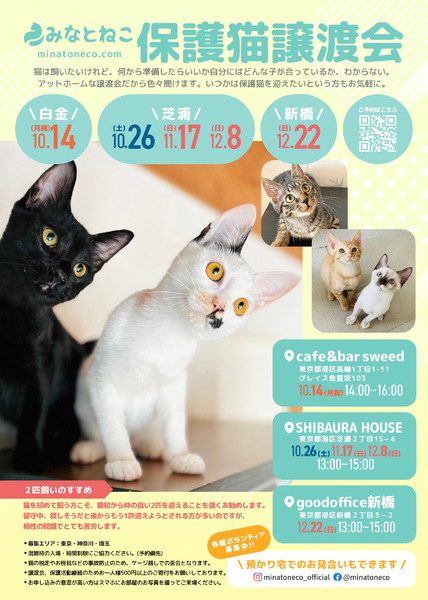 | イベント内容 | みなとねこが毎月定期開催している譲渡会です 2024年も譲渡会を通じて289匹もの猫を161家庭にご縁を繋ぐことができました 譲渡会にはご来場予約が必要です ご予約はみなとねこのHPよりお願いします https://www.minatoneco.com/event 参加猫の詳細はこちら https://www.minatoneco.com/gallery 参加猫たちの様子はYoutubeのみなとねこチャンネルもご覧ください https://youtube.com/playlist?list=PLRxhCqU-Dt77IaUtZCDeratPPI7Jek6ZL ーーー 会場は明るく開放的な雰囲気です Youtube「みなとねこ譲渡会に行ってみよう」 https://youtu.be/8Q4Gti1swQk 25ケージ 60匹ほどの参加となりますが、それ以外の預かり宅の猫もご紹介可能です 子猫は2匹ペアでの譲渡が原則です 初めての方こそ最初から2匹をお勧めしています また私たちボランティアは、ご縁のあった猫たちに終生里親様に愛されて幸せに安全に暮らして欲しいと願っています このため里親になっていただくにはいくつかの条件やお約束事があります。 ◆基本条件(猫それぞれ、保護主により異なります) ・ご家族全員が飼育に賛成であること ・ペット可物件での完全室内飼い、エアコンなどによる室温管理、医師の指示に従い定期的な受診やワクチン接種、 適切な時期(生後4ヶ月中)での避妊去勢、病気予防に配慮したフードの選択、終生飼養をお願いしております。 ・ケージのみの飼育、リビング以外の一室のみでの飼育は不可です。十分な運動のスペースと窓から景色が眺められのんびり日向ぼっこが可能な環境が望ましいと考えています。 ・誤食などの事故防止のため、お部屋の整理整頓や脱走防止にも万全の対策をお願いします。 ・換気が十分でない室内での喫煙をされる方はお断りしております。 ・日々のお世話だけでなく、スキンシップが可能な精神的・時間的・経済的な余裕がある方に限らせていただきます。猫が20年以上生きる中でなるべく変わらぬ環境で愛情を注いで頂けるよう、家族構成やお仕事、お住まいに変化のない方を優先させていただきます。 またお届けやフォローの都合上、募集エリアも東京、神奈川、埼玉に限らせていただいております。 ■里親申込書類一式はみなとねこHPよりダウンロードをお願いします https://www.minatoneco.com/foster-entry 会場では里親申込書を拝見して簡単な面談を行います 会場にてご記入いただくことも可能ですが、面談希望の方が多いとお待ちいただくことになりますので、お手元で印刷していただきご記入の上ご来場いただくことをおすすめしております ※ご家族にアレルギーがある方、喫煙者がいる場合には是非事前にご相談ください ※猫と暮らしたことのない未就学児がいらっしゃる場合には事前にアレルギー検査などお勧めします 実際の参加予定猫 10/25(金)21:00までにみなとねこのHPやFacebookページでご紹介します https://m.facebook.com/minatoneco/ 直接ご応募の方は詳細をLINEなどでやりとりの上で預かり宅でのお見合いも行っております そうした中で譲渡会前に里親様が決定することもございますことご了承ください ※予約優先、30分入替制、混雑時は入場をお待ちいただくなどのご協力をお願いしております ※換気のためにドアをオープンしての開催のためにケージ越しでのご対面となりますことご理解ください ※譲渡会の開催や保護活動の継続のため、お一人様500円以上のご寄付をお願いしております |