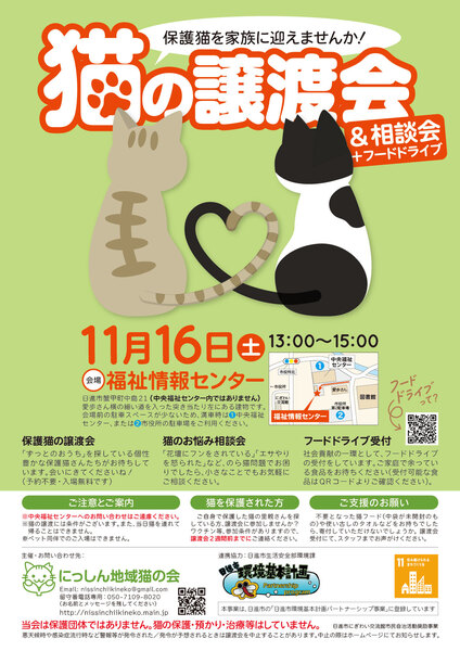 | イベント内容 | 11月16日(土)に「猫の譲渡会&相談会」を開催いたします。 保護猫を迎えたい方はもちろん、猫に関する相談会も同時開催しております。 ご近所との猫トラブルなどでお悩みの方も、どうぞお気軽にお立ち寄りください。 地域貢献の一環として、フードドライブの受付もしております。 ご家庭や職場で余っている食品がありましたらぜひお持ちください! 小さな譲渡会ですが、猫さんも人間も良いご縁を紡げられるよう、のんびり続けています。 遊びにきてくださいね(*^^*) 【日時】11月16日(土)13:00〜15:00 【会場】福祉情報センター ★★★ご注意★★★ 会場は「中央福祉センター」の中ではありません。 その隣の奥まったところにある「福祉情報センター」という小さな建物で開催しております。 お手数ですが、チラシやホームページの地図をご確認の上お越しください。 ★★★★★★★★★ 【入場無料・予約不要】 【主催】にっしん地域猫の会 【ホームページ】https://nissinchiikineko.main.jp ※会場前に駐車場がございますが、数が少ないため、満車時は中央福祉センターの駐車場をご利用ください。図書館のむかいにある市役所の臨時駐車場もご利用いただけます。 ※室内換気のため冷暖房が効きにくい場合がございます。 ※ペット同伴のご入場はできません。 ※猫ちゃんの譲渡には条件がございます。詳細はホームページをご参照ください。 |