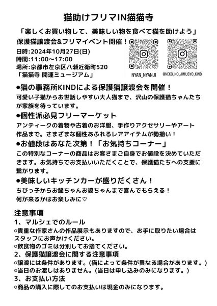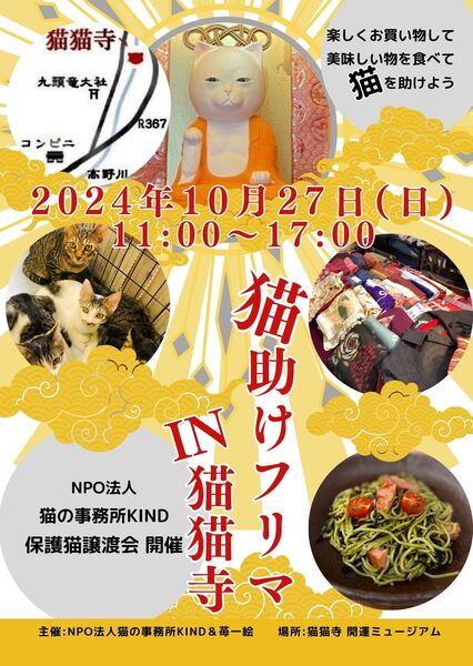 | イベント内容 | 楽しくお買い物して、美味しい物を食べて猫を助けよう! 猫の聖地「猫猫寺」さんのミュージアムをお借りしての保護猫譲渡会を開催!! フリマとキッチンカーグルメの売り上げの一部は保護猫のお世話代になります。 |
