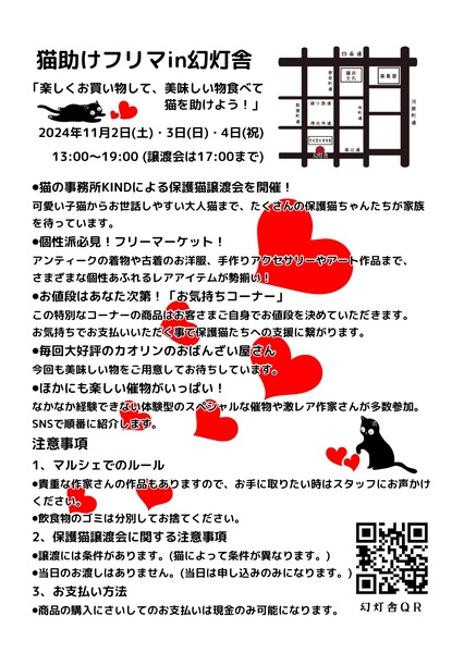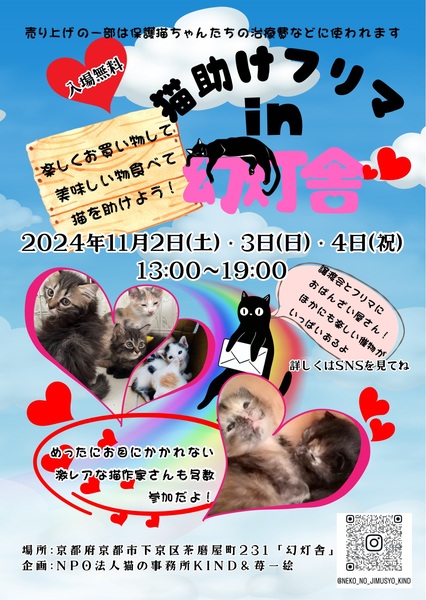 | イベント内容 | 「幻灯舎」さんは京都の繁華街の中心地、四条河原町か徒歩10分のところにある古い町家の写真スタジオです。 保護猫譲渡会の応援で、めったにお目にかかれない激レアなアーティストさんたちが集結! 楽しくお買い物して、美味しい物食べて猫を助けよう! 売り上げの一部は保護猫のお世話代になります。 |
