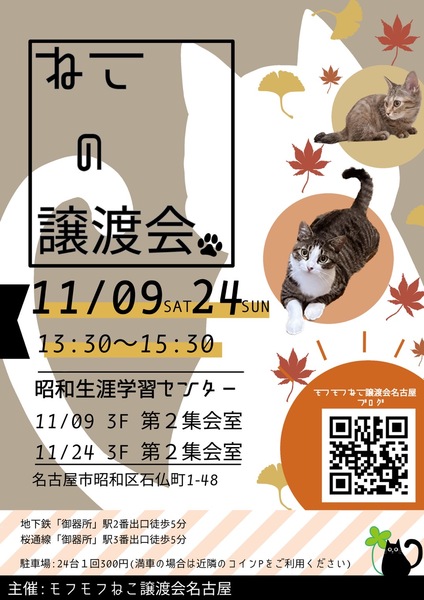 | イベント内容 | モフモフねこ譲渡会名古屋 猫たちの幸せなお家探しのために譲渡会を開催しております。 個人ボランティアの集まりです。 自分たちの出来ることから頑張っております! 一匹でも幸せになれる猫が増えますように 場所 昭和生涯学習センター 第2集会室 住所 名古屋市昭和区石仏町1-48 時間 13時30分~15時30分 交通機関等 地下鉄「御器所」鶴舞線2番出口南約300m 桜通線3番出口南東約300m 駐車場24台(満車の場合は近隣コインPをご利用ください) 参加猫の情報は下記モフモフねこ譲渡会名古屋ブログにてご確認ください。 https://mofumofuneko4.fc2.net/ 【譲渡会について】 ・譲渡会は入場無料、予約不要です。お気軽にご参加ください。 ・会場へのお問い合わせはご遠慮ください。 ご質問は下記メールアドレスへお願いいたします。 mofumofuneko4☆gmail.com ☆を@に変更してお問い合わせください。 ・猫の引き取りはしておりません。 ・譲渡会当日に猫をお渡しすることはありません。 ・保護主によって譲渡条件が違う場合があります。 ・参加予定でも譲渡会前にトライアルになる場合があります。 ご希望の猫がいましたらまずはお問い合わせをお願いいたします。 【参加猫について】 ・ノミ駆除、駆虫、トイレ躾、ワクチン3種接種済。 ・年齢や健康状態に応じて、避妊手術を行っております。 ・参加予定で紹介していても当日体調不良等で欠席になる場合があります。 【譲渡の約束事】 ・ペット飼育可の住宅にお住まいの方。 ・完全室内飼育。 ・脱走防止の対策をしていただける方。 ・避妊手術未実施の場合、避妊手術 の実施と報告をしていただける方。 ・ご家族全員が猫を飼うことに同意していること。 ・譲渡後、しばらく定期連絡を入れていただける方。 *お一人暮らしの方、60歳以上の方は、身内の方の保証が必要となる場合がございます。 #名古屋昭和区 #昭和生涯学習センター #譲渡会 #保護猫 #地域猫 #さくらねこ #tnr #里親募集 #里親募集中 #猫 #ねこ #殺処分ゼロ #買わずに飼おう #モフモフねこ譲渡会名古屋 #ペットショップに行く前に #譲渡会のお知らせ #猫と暮らしたい |
