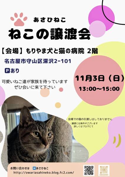 | イベント内容 | 行政機関(保健所・動物愛護センター)から引き取った猫や、地域猫活動中に保護した猫達に家族を探しています (=゚ω゚=) ♡猫を初めて迎えてみたい ♡運命の猫ちゃんと出会いたい ♡先住猫ちゃんの仲間探し 皆様のご来場をお待ちしております! 11月3日(日) 13:00〜15:00 ※毎月第1日曜日 会場 もりやま犬と猫の病院 2F 愛知県名古屋市守山区深沢2-101 駐車場あり ※病院へのお問い合わせはご遠慮下さい お問い合わせはコチラ ma47m@yahoo.co.jp ┈┈┈┈┈┈┈┈┈┈ ◎全頭ワクチン接種、ウイルス(FIV、FeLV)検査、マイクロチップ装着済み ◎譲渡には条件がございます 詳しくは下記ブログをご覧ください ↓↓↓ 主催者【あさひねこ】ブログ http://owariasahineko.blog.fc2.com/ |