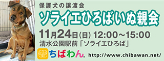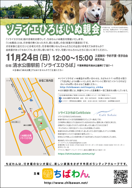 | イベント内容 | 清水公園駅前のソライエひろばをお借りして、ソライエひろばいぬ親会を開催いたします。 飼い主探しをしている保護犬達に会いにきてみませんか。 ※いぬ親会見学は予約等必要ありません。無料でどなたでも入場できます。。 ※ネットによる募集も平行して行っているため、参加予定の犬が当日までに決定・不参加となる場合もあります。 ※イベントバナーに写真が掲載されている犬が参加するとは限りません。参加犬は本サイトに順次掲載されますのでそちらをご確認ください。 日時:11月24日(日)12:00~15:00 雨天中止 場所:ソライエひろば 千葉県野田市清水公園東2丁目2−1 【会場アクセス】 東武野田線 清水公園駅東口より徒歩1分 当日会場の駐車場はご利用になれません。お車の方は近隣のコインパーキングをご利用ください。 【注意事項】 《ご来場される皆様へのお願い》 臆病な性格の犬や、子供さんを苦手とする犬も参加しています。いきなり触ったりせず、まずボランティアに声をかけてください。 お子様と一緒にご来場される際には、手を繋ぐなどして頂き、お子様だけで参加犬に近づくことのないようご注意ください。 会場に同伴される犬には、必ずリード(引き綱)をつけてください。 【当日の流れ】 (1)家族募集中のいぬとお会いになりたい方はどなたでもご参加いただくことができます。ちばわんボランティアは名札をつけておりますので、ご遠慮なくお声をかけて下さい。また、募集中のいぬのそばには預かりボランティアが控えておりますのでいぬの性格や生活習慣など、遠慮なくご質問ください。 (2)ご希望のいぬが決まったら、お申し込みアンケートにご記入の上、ボランティアにお渡し下さい(前日までにメールでアンケートを送信してお申し込みいただくこともできます。) ◆「いぬ」アンケート送信先:https://chibawan.net/contactform_dog (3)アンケート内容を拝見し、お話させていただきます。 (4)原則として3日以内にお返事の連絡をさせていただきます。 (5)ご縁が成立した場合には、後日、こちらからご自宅までいぬをお届けし、約1ヶ月のお試し生活に入っていただきます。お届けの際に、書面での譲渡契約書を交わします。 ※ワクチン・不妊手術代など保護犬にかかった費用は、家族になるいぬ親さんにもご負担をお願いしています 【お知らせ】 ◆会場ではチャリティグッズを販売します ◆売上金は保護した犬猫の医療費など、ちばわん活動費として大切に使わせていただきます 【お問い合わせ】 いぬ親会について:https://chibawan.net/inquiry_chiba ※いぬ親会当日はメールが見れません。また、お問い合わせの際は、必ず「具体的な件名」を入れて多数の迷惑メールと区別がつくようにお願いいたします。 ソライエひろばいぬ親会イベントホームページ https://chibawan.net/event/20241124-solaiehiroba-dog ちばわんホームページ https://chibawan.net/ |