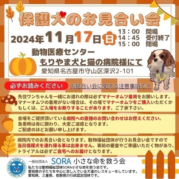 | イベント内容 | 保護犬のお見合い会を開催致します。 先住ワンちゃんを一緒にお連れの際は必ずマナーオムツ着用をお願いします。 マナーオムツの着用がない場合は、その場でマナーオムツをご購入頂くか、もしくは、ご入場をお断りすることがあります。 ご了承下さい。 【注意】会場をご提供頂いている病院への直接のお問い合わせはお控えください。急患時は命に関わり、大変ご迷惑となります。ご配慮のほどお願い申し上げます。 もりやま犬と猫の病院さま2階会議室 〒463-0811名古屋市守山区深沢2-101 <ご注意>事前のお申込みは不要です。保護活動ブログで、開催日の数日前に譲渡会参加が決定したワンコたちのご案内もしておりますので、ご希望のワンコの参加をご確認してお越し頂けますと幸いです。 SORA公式ホームページhttps://sora-chiisana.org/foster/ SORA公式活動メインブログhttps://ameblo.jp/sora-chisana-inochi/ SORAイベントブログhttps://ameblo.jp/sora-charity-events/ |
