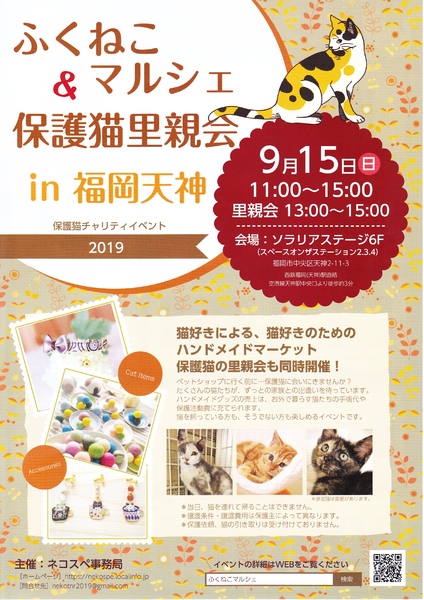 | イベント内容 | 天神のど真ん中で保護猫譲渡会やります! 猫好きによる猫好きのためのチャリティイベントです。 ハンドメイドマルシェも同時開催。 猫の首輪やおもちゃなど猫グッズもりだくさん! 売り上げは保護猫活動費に充てられます。 参加猫はホームページにて随時紹介していきます。 保護猫たちがずっとの家族との出逢いを待っています。 |