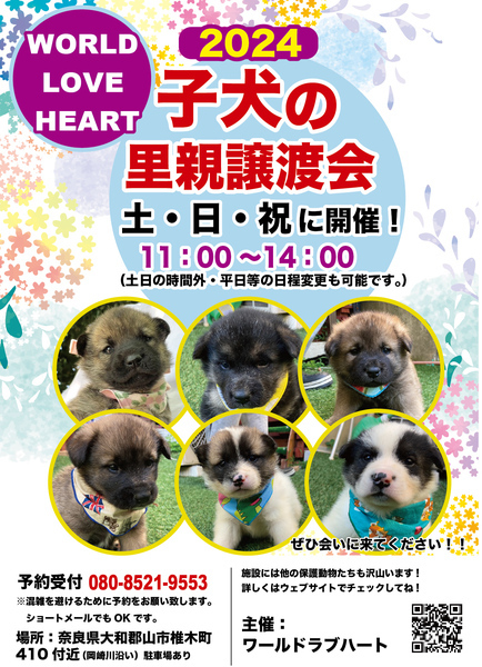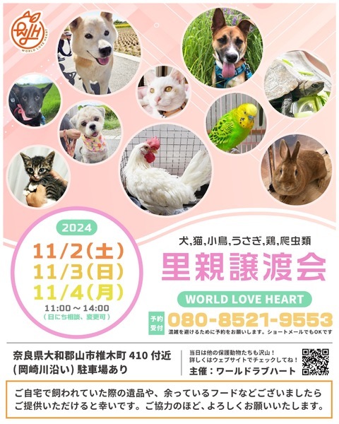 | イベント内容 | ワールドラブハートで里親募集中の動物たちの譲渡会を開催します! 犬猫だけではなく、インコやウサギ、チンチラに亀などたくさんの保護動物がいます! みんな新しい家族を探しています。写真だけでは伝えきれない魅力が盛りだくさん! 実際に会ってそのかわいさを実感してください♪ ★里親募集中の動物たち★ https://satoya-boshu.net/foster/?@button_name@=search&FosterParent_MemberID=1161 ・犬、猫 ・インコ ・ウサギ ・チンチラ ・ハムスター ・小鳥 ・チャボ ・カメ ……など 子犬や子猫もたくさんいますよ♡ ぜひお気軽にお越しください! ●混雑をさけるために、事前予約をお願いします。 予約番号080-8521-9553 ショートメールでも可♪ ●当日までに譲渡が決定した・体調がすぐれないなど、やむを得ない理由で不参加の場合があります。ご希望の子がいましたら、当日お問い合わせください。 ●当日、その場での引き渡しはしておりません。譲渡決定後、自宅訪問を兼ねてこちらからお届け致します。 ご来場お待ちしております♪ ★world love heart(ワールドラブハート)は、奈良県大和郡山市で活動している動物保護団体です。 『引き取り依頼は断らない』をモットーに、犬、猫、鶏、小動物、家畜、爬虫類など捨てられた動物を保護しています。 https://worldloveheart-nara.jimdofree.com |