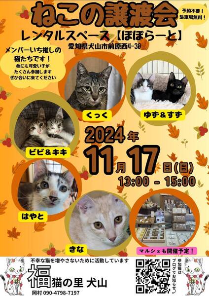 | イベント内容 | 【ココがポイント!】 ★ウイルスチェックなど健康診断済み! 【日時】 11月17日(日)13~15時 【場所】 レンタルスペースぽぽらーと (犬山市前原西4丁目30) 予約不要 広々駐車場あり 福猫の里 犬山「福猫の里便り」 https://hukunekonosato.hatenablog.com/ 【お約束】 当日、会場での猫の引き渡しはしておりません。 後日ご自宅までお届けします。 お試し飼育(トライアル)を1週間〜2週間程して頂き、双方が納得の上で正式譲渡となります。 譲渡の際は、医療費(ワクチン代等)、活動協力費の負担をお願いしております。 ・ペット可のお住まい ・完全室内飼育、終生飼育 ・適切な医療措置 ・不妊手術の実施と報告等、お約束があります。 《 譲渡に関するお願い 》 ◎猫の負担を考え、東海3県で車移動が1時間以内にお住まいの方。(遠方の方はお断りしています。)※通行料がかかりましたらご負担頂く場合もあります。 ◎高齢者のみ世帯への譲渡はお断りしています。託せる方がいれば、一緒に来場下さい。 ◎譲渡は、無償ではありません。猫によって費用が違いますので保護主にお尋ね下さい。 |