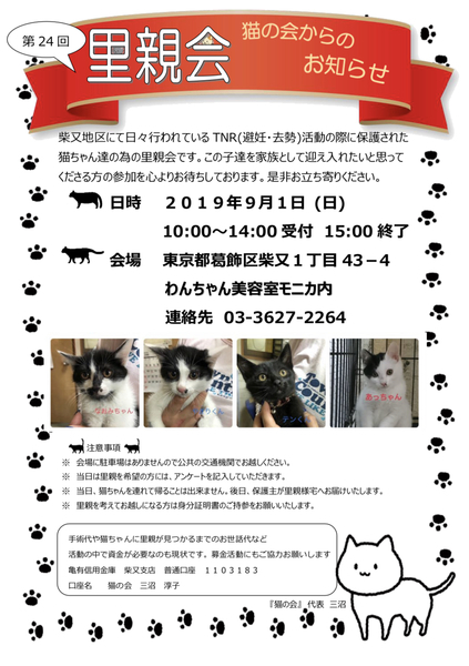 | イベント内容 | 東京都葛飾区を中心に野良猫の手術依頼の際に保護した子、保護依頼があった子などが参加しています。 ワンちゃんのお洋服を販売するチャリティーバザーも開催します。 会場は京成柴又駅下車3分くらいの場所にあるワンちゃんのトリミングサロンです。 現在、生後半年以内の27匹の子が素敵なご縁を待っています。 |
