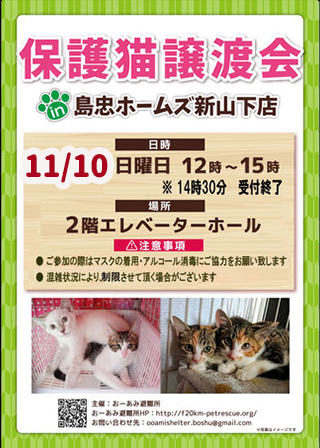 | イベント内容 | ☆★☆★☆★☆★☆★☆★☆★☆★☆★☆★☆ ~11月10日(日)新山下にて譲渡会開催!~ ◎場所・・「島忠ホームズ 新山下店」 神奈川県横浜市中区新山下2丁目12−34 JR根岸線「桜木町駅」より横浜市営バス(8.26.58.148系統)乗車「貯木場前」より徒歩約5分 みなとみらい線「元町・中華街駅」より徒歩約15分 ◎日程・・11月10日(日)(雨天決行) ◎時間・・12時から15時 【14時30分受付終了】 (会場に利用可能な無料駐車場がございます。そちらをご利用くださいませ。) *混雑状況により、制限させて頂く場合がございます。 ※参加予定の犬猫は体調により参加できない場合があります。ご了承ください。 ☆★☆★☆★☆★☆★☆★☆★☆★☆★☆★☆ |