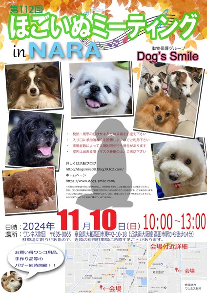 | イベント内容 | 11月10日(日曜日)10時~13時、奈良県大和高田市のワンネス財団エモーショナルリテラシーセンターをお借りして「第112回ほごいぬミーティングat奈良大和高田」を開催します。 保護犬を家族に迎えようと考えている方、保護犬に会ってみたい方、保護犬について知りたい方、ぜひご来場ください。 相性を見るためなど先住わんこさん、卒業わんこさんのご参加ももちろんOKです。 当日は、Dog's smileグッズやワンコ用品の販売、Dog's smileを応援してくださる方々が手作りされた手作り雑貨などの販売も行います。どれもお買い得です。 また、売り上げは、私たちの活動資金になります。ぜひご協力をお願いします。 来場者のみなさまには、感染症の予防に御協力をお願いします。 ・発熱・風邪の症状のある方の入場は御遠慮願います。 ・入場時は、手指消毒への御協力をお願いします。 ・来場者の状況により、入場制限を行う場合があります。 なお、来場予定のワンコについては、活動ブログでご確認ください。 日時 令和6年11月10日(日)午前10時~午後1時 場所 ワンネス財団エモーショナルリテラシーセンター 奈良県大和高田市東中2-10-18 (近鉄南大阪駅高田市駅から南に徒歩14分) 協力 ワンネス財団、株式会社松田電気工業 |