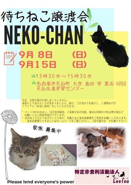 | イベント内容 | ♡待ちねこ♡譲渡会 子猫まつり!です 日時 2019年9月8日(日) 13:30~15:30 場所 天白生涯学習センター2階和室 名古屋市天白区 天白町島田 黒石4050 (天白公園内) 主催 NPO法人Leeloo 待ちねこ譲渡会 HP http://machineko.kilo.jp/ 当会が活動を行っている地域から保護をした猫たちが参加します。 健康診断、基本治療を済ませ、ワクチン接種を行った健康で元気な猫たちです。 予約不要 見学自由 当日、会場で猫のお渡しはいたしません。 家族として迎えたい子が決まりましたら、後日、ご自宅までお届けし、1週間ほどの トライアル(お試し飼育)をしていただきます。 * ペット可のお住まい、完全室内飼育、ご家族全員の同意、適切な時期の不妊去勢手術など お願いしたい約束事項がございます。 * 次のねこたちにつなげていくために、里親さまに基本治療費のご負担をお願いしております。 基本治療費につきましてはホームページをご覧ください。 ♡たくさんのねこたちが新しい家族を待っています。 ♡ねこたちとゆっくり触れ合ったり、抱っこしたりできます♪ ♡ぜひ可愛いねこたちに会いにいらしてください! |