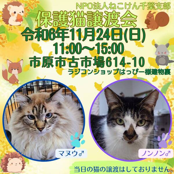 | イベント内容 | 今年生まれの子猫が続々登場!! 子猫からシニア猫まで、沢山の保護猫達が譲渡会に参加します♪ ブログにて、譲渡会に参加する猫さん達を紹介しております。 ねこけん千葉支部ブログ→ https://ameblo.jp/nekoken-chiba/ 通常スタイルの譲渡会と致しますが、コロナウイルス対策として ・会場内ではマスクのご着用と入退室の際は消毒をお願い致します。 ・ご予約無しでお越しいただけますが、混雑時は整理券を配らせていただきます。 ご協力の程よろしくお願い致します。 また、譲渡会会場では、千葉県内にお住いの預かりボランティアさん及びお世話ボランティアさんを募集しています。 ご希望の方は、大変お手数をおかけしますが、譲渡会までお越しください。 ※ご都合がつかない場合は、お問い合わせ先までご相談ください。 [日時] 11月24日(日)11:00~15:00 [会場] 千葉県市原市古市場614-10 ※屋内での開催となり雨天決行です。 ※抱っこもOK! ※猫ちゃんの負担も考え、ご来場は時間内にお願い致します。 ※特にご予約などは必要ございませんのでご家族皆様でぜひお越し下さい。 ※駐車場あり。 [交通] 交通機関を利用してお越しの方 JR内房線 浜野駅より徒歩13分 浜野駅は、東京駅から京葉線→内房線でおよそ50分の距離!! お車でお越しの方 京葉道路蘇我インターより車で10分 ※駐車場はラジコンショップハッピー様裏手にございます駐車場をご利用ください [譲渡ご希望の方へのお願い] 誠に恐れ入りますが下記に当てはまります方への譲渡は不可となりますので予めご了承下さい。 ①学生さん、未成年の方、安定収入のない方 ②ペットを飼う事を許されていない住宅にお住まいの方 ③身体的、精神的疾病で治療中の方 ※60歳以上の方は別途条件がございますのでご相談下さい。 [譲渡の流れ] お申込み→審査→後日お届け→トライアル→正式譲渡 ※当日のお連れ帰りは出来ませんので予めご了承ください。 ※仮譲渡時にご希望の猫ちゃんにかかった医療費(ウイルス検査・ワクチン・駆虫・不妊去勢手術等)をご負担願います。 しかし、正式譲渡に至らなかった場合は医療費を全額返済致します。 [主催] 動物愛護団体 NPO法人ねこけん 千葉支部 [ブログ] https://ameblo.jp/nekoken-chiba/ [参加動物] 成猫・子猫 [お問い合わせ] ご不明な点、ご質問等ございましたら下記までお問い合わせください。 chiba.info@nekoken.jp |
