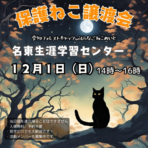 | イベント内容 | 日時 12月1日(日) 14時~16時 場所 名東生涯学習センター 主催 愛知フォレストキャッツwithなごねこめいと 地域猫活動やTNR活動の過程などで 保護した猫たち 子猫もいれば、大人猫もいます 見学、相談だけでも大丈夫! 予約不要、参加費無料なのでお気軽に 猫に関する活動を何かしたい、という方も歓迎です 遊びに来る感覚で、お越しくださいませ ☆猫に関して☆ 各団体の保護主さんごとに決めているお約束事があります ・当日は猫を連れ帰ることはできません ・猫を迎えるにあたり、飼育環境などについて お話しをさせていただきトライアル(お試し飼育) から始めさせていただきます ・2週間前後のトライアル期間を経て、問題ない ようであれば、譲渡契約書を結び正式譲渡と なります ・所定の譲渡費用をいただきます |