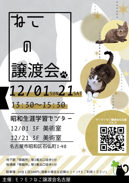 | イベント内容 | モフモフねこ譲渡会名古屋 猫たちの幸せなお家探しのために譲渡会を開催しております。 個人ボランティアの集まりです。 自分たちの出来ることから頑張っております! 一匹でも幸せになれる猫が増えますように 場所 昭和生涯学習センター 美術室 住所 名古屋市昭和区石仏町1-48 時間 13時30分~15時30分 交通機関等 地下鉄「御器所」鶴舞線2番出口南約300m 桜通線3番出口南東約300m 駐車場24台(満車の場合は近隣コインPをご利用ください) 参加猫の情報は下記モフモフねこ譲渡会名古屋ブログにてご確認ください。 https://mofumofuneko4.fc2.net/ 【譲渡会について】 ・譲渡会は入場無料、予約不要です。お気軽にご参加ください。 ・会場へのお問い合わせはご遠慮ください。 ご質問は下記メールアドレスへお願いいたします。 mofumofuneko4☆gmail.com ☆を@に変更してお問い合わせください。 ・猫の引き取りはしておりません。 ・譲渡会当日に猫をお渡しすることはありません。 ・保護主によって譲渡条件が違う場合があります。 ・参加予定でも譲渡会前にトライアルになる場合があります。 ご希望の猫がいましたらまずはお問い合わせをお願いいたします。 【参加猫について】 ・ノミ駆除、駆虫、トイレ躾、ワクチン3種接種済。 ・年齢や健康状態に応じて、避妊手術を行っております。 ・参加予定で紹介していても当日体調不良等で欠席になる場合があります。 【譲渡の約束事】 ・ペット飼育可の住宅にお住まいの方。 ・完全室内飼育。 ・脱走防止の対策をしていただける方。 ・避妊手術未実施の場合、避妊手術 の実施と報告をしていただける方。 ・ご家族全員が猫を飼うことに同意していること。 ・譲渡後、しばらく定期連絡を入れていただける方。 *お一人暮らしの方、60歳以上の方は、身内の方の保証が必要となる場合がございます。 #名古屋昭和区 #昭和生涯学習センター #譲渡会 #保護猫 #地域猫 #さくらねこ #tnr #里親募集 #里親募集中 #猫 #ねこ #殺処分ゼロ #買わずに飼おう #モフモフねこ譲渡会名古屋 #ペットショップに行く前に #譲渡会のお知らせ #猫と暮らしたい |