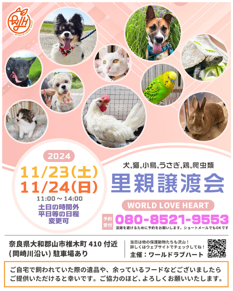 | イベント内容 | ワールドラブハートで里親募集中の動物たちの譲渡会を開催します! 犬猫だけではなく、インコやウサギ、チンチラに亀などたくさんの保護動物がいます! みんな新しい家族を探しています。写真だけでは伝えきれない魅力が盛りだくさん! 実際に会ってそのかわいさを実感してください♪ ★里親募集中の動物たち★ https://satoya-boshu.net/foster/?@button_name@=search&FosterParent_MemberID=1161 ★里親募集中の動物たち★ ・犬、猫 ・インコ ・ウサギ ・チンチラ ・ハムスター ・小鳥 ・チャボ ・カメ ……など 子犬や子猫もたくさんいますよ♡ ぜひお気軽にお越しください! ●混雑をさけるために、事前予約をお願いします。 予約番号080-8521-9553 ショートメールでも可♪ ●当日までに譲渡が決定した・体調がすぐれないなど、やむを得ない理由で不参加の場合があります。ご希望の子がいましたら、当日お問い合わせください。 ●当日、その場での引き渡しはしておりません。譲渡決定後、自宅訪問を兼ねてこちらからお届け致します。 ご来場お待ちしております♪ ★world love heart(ワールドラブハート)は、奈良県大和郡山市で活動している動物保護団体です。 『引き取り依頼は断らない』をモットーに、犬、猫、鶏、小動物、家畜、爬虫類など捨てられた動物を保護しています。 https://worldloveheart-nara.jimdofree.com |