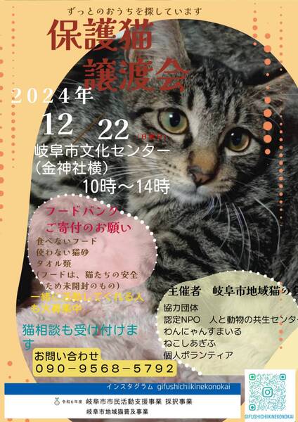 | イベント内容 | 今年最後の一大イベント 岐阜市文化センターで保護猫譲渡会を開催します。 岐阜市のTNR現場で保護された行き場のない猫たちを 1匹でも多く里親様にご縁を繋げたい。 お正月は、お家で過ごせることを願って 皆様、是非お越しくださいね。 猫たちとお待ちしております。 |