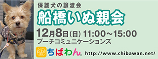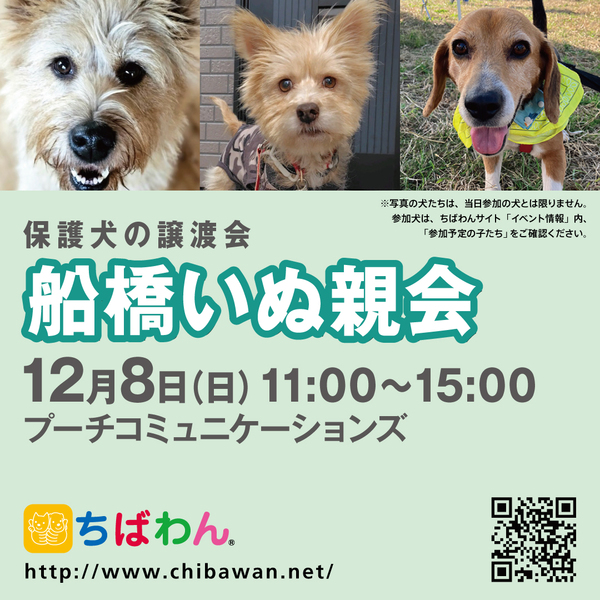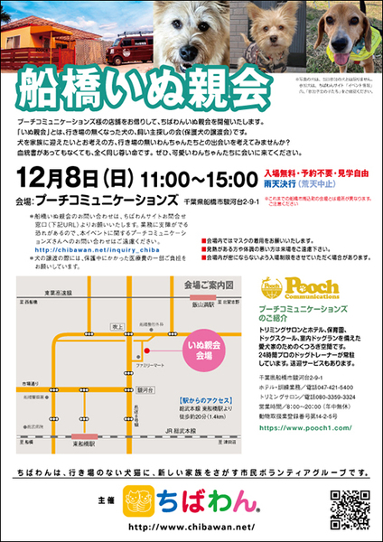 | イベント内容 | 12月船橋いぬ親会のご案内です。 poochさんのご厚意により、プーチコミュニケーションズ(船橋市駿河台)のドッグランをお借りして「船橋いぬ親会」を開催することになりました。 屋根付きのドッグランでの開催になります。 【ちばわんからのお願い】 ①会場内ではマスクの着用をお願いします。 ②発熱がある方や体調が悪い方は来場をご遠慮ください。 ③会場内が密にならないよう入場制限をさせていただく場合があります。 開催日:12月8日(日)11:00~15:00 屋外開催(屋根付きドッグラン) 小雨決行 場所:プーチコミュニケーションズ 千葉県船橋市駿河台2-9-1 【アクセス】 飯山満駅から徒歩約20分 JR東船橋駅から徒歩約20分 県道8号線 吹上交差点~駿河台交差点間にあるファミリーマートの裏手になります。 リサイクルショップとファミリーマートの間の道へ進み、最初のT字路を左折してください。 ※店舗の駐車場は5台分のみとなりますので混雑時にはご利用いただけない場合がございます。 満車の場合はコインパーキングをご利用下さい。 《お知らせ》 ◆会場ではチャリティグッズを販売します 売上金は保護した犬猫の医療費など、 ちばわん活動費として大切に使わせていただきます 《お問い合わせ》 いぬ親会について:http://chibawan.net/inquiry_chiba ※いぬ親会当日はメールが見られません。また、お問い合わせの際は、必ず「具体的な件名」を入れて多数の迷惑メールと区別がつくようにお願いいたします。 ※本イベントに関するPoochさんへのお問い合わせはご遠慮ください。 船橋いぬ親会イベントホームページ https://chibawan.net/event/20241208-funabashi-dog ちばわんホームページ https://chibawan.net/ |