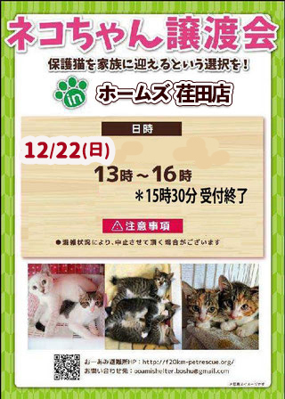 | イベント内容 | ☆★☆★☆★☆★☆★☆★☆★☆★☆★☆★☆★☆★☆ 12月22日(日)荏田にて譲渡会開催! ◎場所・・「島忠ホームズ荏田店」 神奈川県横浜市青葉区荏田西1ー3ー14 田園都市線「江田」駅より徒歩約7分 246号線江田駅交差点そば ◎日程・・12月22日(日)(雨天決行) ◎時間・・13時から16時 【15時30分受付終了】 (会場に利用可能な無料駐車場がございます。そちらをご利用くださいませ。) *参加の際はアルコール消毒のご協力をお願いいたします。 *混雑状況により、中止させていただく場合がございます。 ※参加予定の犬猫は体調により参加できない場合があります。ご了承ください。 ☆★☆★☆★☆★☆★☆★☆★☆★☆★☆★☆★☆★☆ |