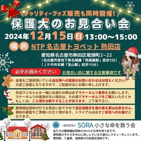 | イベント内容 | 保護犬のお見合い会を開催致します。 ぜひ可愛い保護っ子達に会いに来て下さいね。 チャリティーグッズの収益は、全て保護犬の医療など保護活動使わせていただきます。 事前のお申込みは不要です。保護活動ブログで、開催日の数日前に譲渡会参加が決定したワンコたちのご案内もしておりますので、ご希望のワンコの参加をご確認してお越し頂けますと幸いです。 先住ワンちゃんを一緒にお連れの際は必ずマナーオムツ着用をお願いします。 マナーオムツの着用がない場合は、その場でマナーオムツをご購入頂くか、もしくは、ご入場をお断りすることがあります。ご了承下さい。 SORA公式ホームページ https://sora-chiisana.org/foster/ SORA公式活動メインブログ https://ameblo.jp/sora-chiisana-inochi/ SORAイベントブログ https://ameblo.jp/sora-charity-events/ |