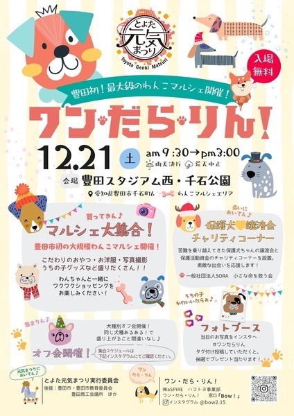 | イベント内容 | 『とよた元気まつり2024』に一般社団法人SORA小さな命を救う会も、お見合い会とチャリティーイベントで参加させていただきます。 フリマでの収益は、全て保護犬の医療など保護活動使わせていただきます。 是非、ご家族みなさんで遊びに来てくださいね。 *雨天決行 先住ワンちゃんを一緒にお連れの際は必ずマナーオムツ着用をお願いします。 マナーオムツの着用がない場合は、その場でマナーオムツをご購入頂くか、もしくは、ご入場をお断りすることがあります。ご了承下さい。 SORA公式ホームページ https://sora-chiisana.org/foster/ SORA公式活動メインブログ https://ameblo.jp/sora-chiisana-inochi/ SORAイベントブログ https://ameblo.jp/sora-charity-events/ |