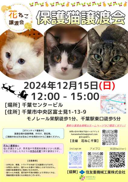 | イベント内容 | 花ねこ譲渡会は、個人保護主さんが保護して大切にお世話した猫の「本当のお家」を探す譲渡会です。 是非一度遊びに来て下さい。ご予約は不要です。 https://hananeko.daa.jp/ |