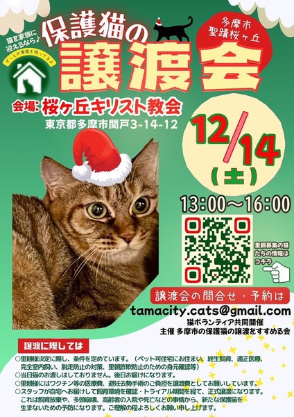 事情があって保護された猫さんたちが参加予定です。 チラシに付いてるQRコードまたはこちらのリンクから 猫たちの様子が見れます。 https://sites.google.com/view/cooneru/ 完全予約制ではありませんが、予約された方から優先的にご案内致します。 参加お申込み・お問合せはコチラ tamacity.cats@gmail.com 【日時】12月14日(土) 13:00〜16:00 【場所】桜ヶ丘キリスト教会 多摩市関戸3-14-12 (聖蹟桜ヶ丘駅 徒歩8分) ※車でお越しの際は近隣のコインパーキングをご利用下さい。 【譲渡までの流れ】 ①譲渡会にて猫を決めたら預かりボランティアに話を聞く ②エントリーシートに記入 ③お届け(里親様宅へお伺いします) ④トライアル期間 ⑤誓約書を交わして本譲渡 【譲渡地域】 多摩市・府中市・日野市・八王子市・立川市・国立市・稲城市・相模原市・町田市・麻生区、他 【譲渡条件】 ①ペット可住宅にお住まいで、同居の方全員の了解がある。 ②経済的・体力的・時間的に猫を養える見込みがある ③完全室内飼い ④終生飼育 ⑤子猫の場合は留守にする時間が短いご家庭 ※単身者・高齢者の方には後見人必須 |