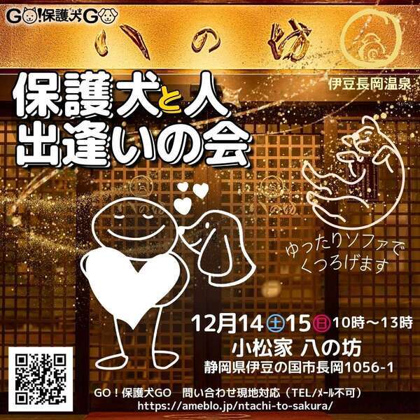 | イベント内容 | まるで自宅リビング?保護犬とソファでくつろげる出逢いの会です。ランキング1位常連の小松家八の坊(伊豆長岡温泉)の温泉床暖房で人も犬もポカポカです。 【イベント】GO!保護犬GO 保護犬と出逢いの会 【日時】12月14・15日(土日)10~13時(屋内開催) 【場所】静岡県伊豆の国市長岡1056−1 小松家八の坊 1階ロビー 【ブログ】http://ameblo.jp/ntachi-to-sakura/ 【インスタ】@gohogoinugo 保健所・殺処分場・多頭崩壊などで引き取り手の出なかった子達です。3カ月~半年以上をかけ体の回復と共に心のリハビリ、家庭犬しつけを行っています。 会場では卒業犬の里親さんに不安を直接相談できます。 |