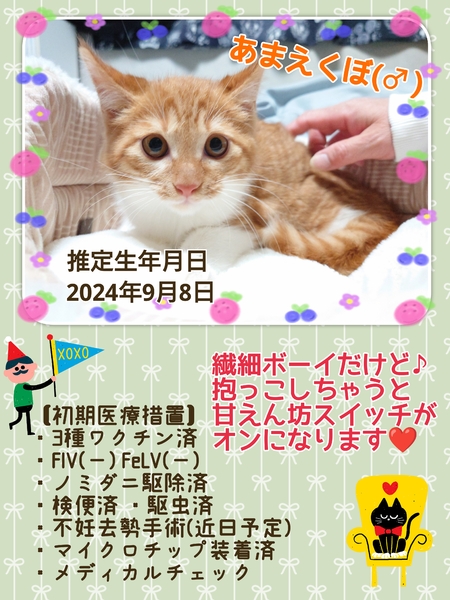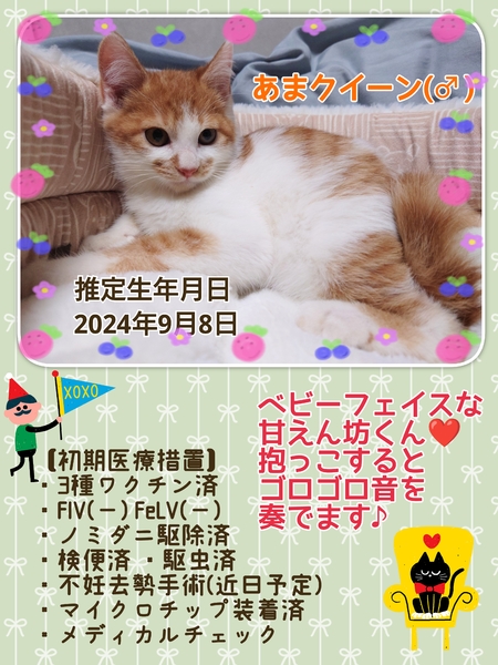 | イベント内容 | 【秘密結社ねこのひげ☆保護猫譲渡会】 12/8(日) 11:30~14:30 川越市高階公民館 講座室2号 (〒350-1142 埼玉県川越市藤間27-1) ⊰᯽⊱┈──╌❊╌──┈⊰᯽⊱ まるまるモフモフな仔猫たちや 脳内は永遠に仔猫だにゃー♪ なオトナ猫が10数頭参加します☆ ご紹介できていない新入りさんたちも♪ 赤い糸をゆっくーーりと 手繰り寄せているいつメンたちも♪ 一同笑顔いっぱいで譲渡会に挑みます♪ 未来のずっとのご家族さまと 愛し愛されな両想いになれますように♡ 是非会いにいらしてくださーい♪ ヾ(*´∀`)ノ もちろん見学だけでもWelcomeです♪ ご不明な点がございましたら インスタグラム@nnnkanto DMにてお問い合わせください☆ |