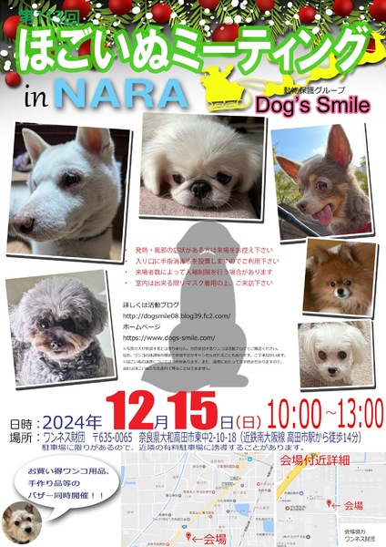 | イベント内容 | 12月15日(日曜日)10時~13時、奈良県大和高田市のワンネス財団エモーショナルリテラシーセンターをお借りして「第113回ほごいぬミーティングat奈良大和高田」を開催します。 保護犬を家族に迎えようと考えている方、保護犬に会ってみたい方、保護犬について知りたい方、ぜひご来場ください。 相性を見るためなど先住わんこさん、卒業わんこさんのご参加ももちろんOKです。 当日は、Dog's smileグッズやワンコ用品の販売、Dog's smileを応援してくださる方々が手作りされた手作り雑貨などの販売も行います。どれもお買い得です。 また、売り上げは、私たちの活動資金になります。ぜひご協力をお願いします。 来場者のみなさまには、感染症の予防に御協力をお願いします。 ・発熱・風邪の症状のある方の入場は御遠慮願います。 ・入場時は、手指消毒への御協力をお願いします。 ・来場者の状況により、入場制限を行う場合があります。 なお、来場予定のワンコについては、活動ブログでご確認ください。 日時 令和6年12月15日(日)午前10時~午後1時 場所 ワンネス財団エモーショナルリテラシーセンター 奈良県大和高田市東中2-10-18 (近鉄南大阪駅高田市駅から南に徒歩14分) 協力 ワンネス財団、株式会社松田電気工業 |