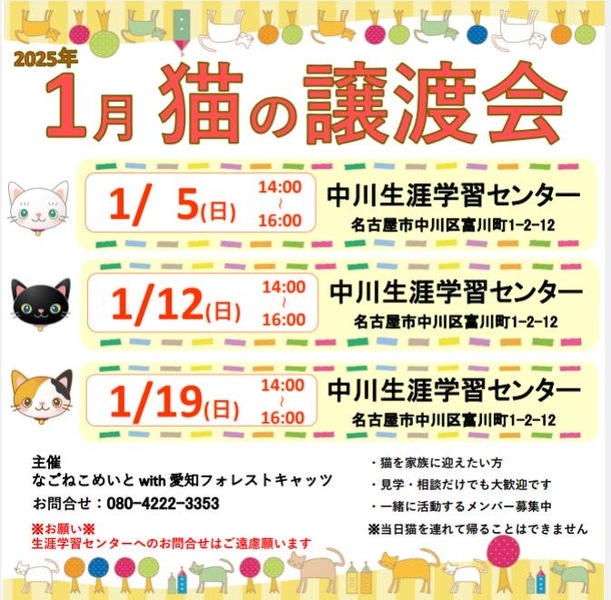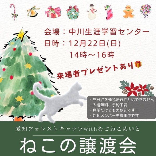 | イベント内容 | 日時 12月22日(日) 14時~16時 場所 中川生涯学習センター 主催 愛知フォレストキャッツwithなごねこめいと 地域猫活動やTNR活動の過程などで 保護した猫たち 子猫もいれば、大人猫もいます 見学、相談だけでも大丈夫! 予約不要、参加費無料なのでお気軽に 猫に関する活動を何かしたい、という方も歓迎です 遊びに来る感覚で、お越しくださいませ 来場者特典!は来てのお楽しみ! ☆猫に関して☆ 各団体の保護主さんごとに決めているお約束事があります ・当日は猫を連れ帰ることはできません ・猫を迎えるにあたり、飼育環境などについて お話しをさせていただきトライアル(お試し飼育) から始めさせていただきます ・2週間前後のトライアル期間を経て、問題ない ようであれば、譲渡契約書を結び正式譲渡と なります ・所定の譲渡費用をいただきます |
