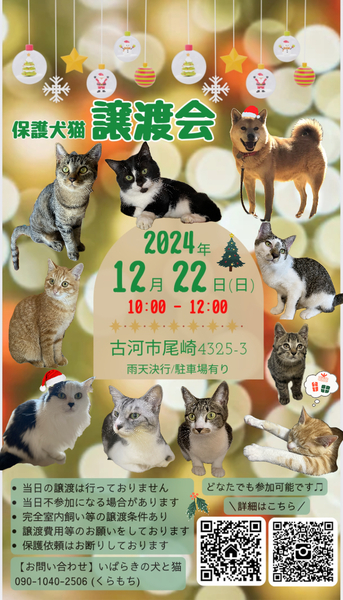 | イベント内容 | 保護犬猫を家族に迎えてみませんか? ずっとのおうちを待っています.* 2024年最後の譲渡会です☻ 迎えたい方も会ってみたい方もどなたでも大歓迎です♪ お待ちしております! 予約不要/雨天決行/駐車スペース有 (開催場所が分かりにくいので下記の連絡先までご連絡頂ければご案内致します) ※譲渡条件などありますので当会の里親募集ページやHPをご確認ください※ 【不要になったフード(未開封).タオル.ペットシートなどありましたら、ご寄付いただけると助かります】 ⚫︎お問合せ⚫︎ 電話▷090-1040-2506 (クラモチ) LINE ID▷ 717217 (モトハシ) |