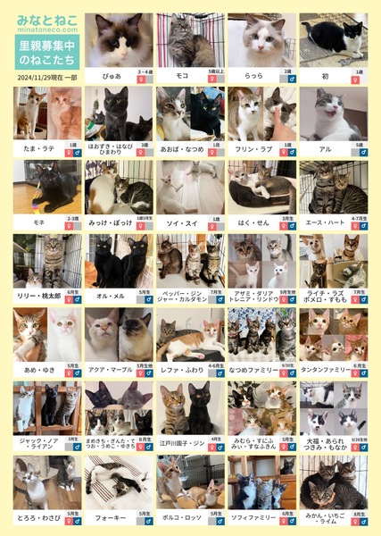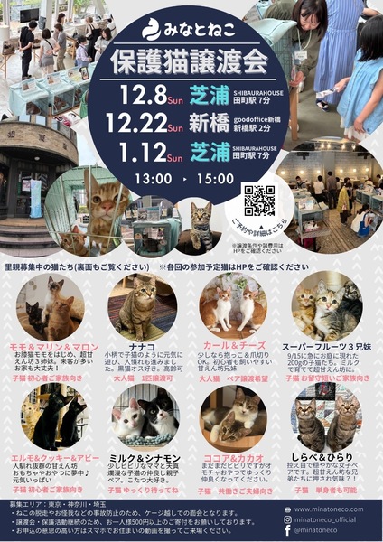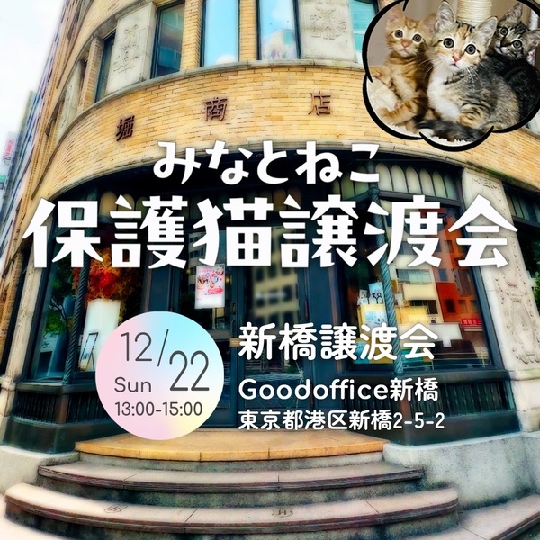 | イベント内容 | みなとねこが毎月定期開催している譲渡会です 2023年も譲渡会を通じて289匹もの猫を161家庭にご縁を繋ぐことができました 新橋駅前の港区で一番古い、昭和7年に誕生した堀ビル、登録有形文化財が2020年にgoodoffice新橋としてリノベーションされましたがそのラウンジで開催いたします。 譲渡会にはご来場予約が必要です ご予約はみなとねこのHPよりお願いします https://www.minatoneco.com/event 参加猫の詳細はこちら https://www.minatoneco.com/gallery 参加猫たちの様子はYoutubeのみなとねこチャンネルもご覧ください https://youtube.com/playlist?list=PLRxhCqU-Dt77IaUtZCDeratPPI7Jek6ZL ーーー 会場は明るく開放的な雰囲気です Youtube「みなとねこ譲渡会に行ってみよう」 https://youtu.be/8Q4Gti1swQk 20ケージ 40匹ほどの参加となりますが、それ以外の預かり宅の猫もご紹介可能です 子猫は2匹ペアでの譲渡が原則です 初めての方こそ最初から2匹をお勧めしています また私たちボランティアは、ご縁のあった猫たちに終生里親様に愛されて幸せに安全に暮らして欲しいと願っています このため里親になっていただくにはいくつかの条件やお約束事があります。 ◆基本条件(猫それぞれ、保護主により異なります) ・ご家族全員が飼育に賛成であること ・ペット可物件での完全室内飼い、エアコンなどによる室温管理、医師の指示に従い定期的な受診やワクチン接種、 適切な時期(生後4ヶ月中)での避妊去勢、病気予防に配慮したフードの選択、終生飼養をお願いしております。 ・ケージのみの飼育、リビング以外の一室のみでの飼育は不可です。十分な運動のスペースと窓から景色が眺められのんびり日向ぼっこが可能な環境が望ましいと考えています。 ・誤食などの事故防止のため、お部屋の整理整頓や脱走防止にも万全の対策をお願いします。 ・換気が十分でない室内での喫煙をされる方はお断りしております。 ・日々のお世話だけでなく、スキンシップが可能な精神的・時間的・経済的な余裕がある方に限らせていただきます。猫が20年以上生きる中でなるべく変わらぬ環境で愛情を注いで頂けるよう、家族構成やお仕事、お住まいに変化のない方を優先させていただきます。 またお届けやフォローの都合上、募集エリアも東京、神奈川、埼玉に限らせていただいております。 ■里親申込書類一式はみなとねこHPよりダウンロードをお願いします https://www.minatoneco.com/foster-entry 会場では里親申込書を拝見して簡単な面談を行います 会場にてご記入いただくことも可能ですが、面談希望の方が多いとお待ちいただくことになりますので、お手元で印刷していただきご記入の上ご来場いただくことをおすすめしております ※ご家族にアレルギーがある方、喫煙者がいる場合には是非事前にご相談ください ※猫と暮らしたことのない未就学児がいらっしゃる場合には事前にアレルギー検査などお勧めします 実際の参加予定猫 12/21(土)21:00までにみなとねこのHPやFacebookページでご紹介します https://m.facebook.com/minatoneco/ 直接ご応募の方は詳細をLINEなどでやりとりの上で預かり宅でのお見合いも行っております そうした中で譲渡会前に里親様が決定することもございますことご了承ください ※予約優先、30分入替制、混雑時は入場をお待ちいただくなどのご協力をお願いしております ※換気のためにドアをオープンしての開催のためにケージ越しでのご対面となりますことご理解ください ※譲渡会の開催や保護活動の継続のため、お一人様500円以上のご寄付をお願いしており |
