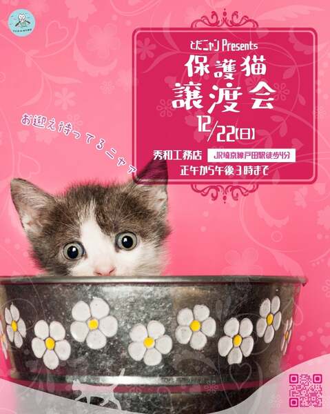 | イベント内容 | 今年最後の譲渡会。 可愛い2.5ヶ月~3ヶ月弱の子猫ちゃん4頭と大きい猫が2頭並ぶ予定です。 日程 12月22日(日) 12時00分~15時00分まで 場所 秀和工務店 JR埼京線 戸田駅 東口 徒歩9分 住所 〒335-0021 埼玉県戸田市新曽309−1 ヤオコーから徒歩90秒のところにあります。 室内開催のため雨天でも開催します。 *子猫の場合トライアルはありません。良くお考えの上お申し込み下さい。 *遠方へのお届けは希望しておりません。戸田から高速使わず1時間以内のところを希望しております。 *小さなお子様または乳幼児のいるご家族に子猫の譲渡はしておりません。 *高齢者のみのご家族には子猫の譲渡はしておりません。年齢にあった猫をご紹介しております。 譲渡会に出る子猫や成猫の様子などはブログをご覧になって下さい。 アメブロ https://ameblo.jp/sakutotaro203/ インスタ @toda_nyan いつもながらすみません。 募金のご協力をお願いします。 あと、フード、トイレシートトイレチップなど余り物がありましたらご支援をお願い致します。 当会の譲渡会は予約制ではありません。 お気軽にお越しくださいませ。 よろしくお願いいたします。 |