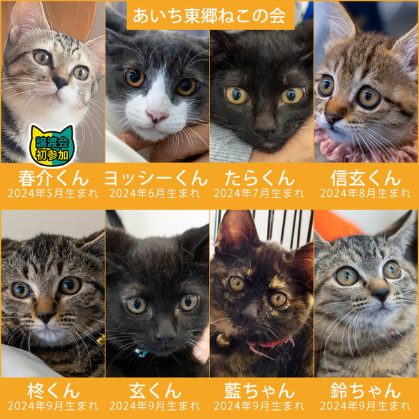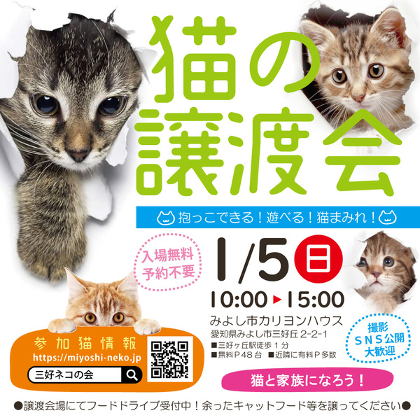 | イベント内容 | 新年最初の譲渡会は子猫多め31匹参加★ http://miyoshineko.sblo.jp/article/191191346.html 2025年を猫年にしませんか?ネコと家族になりませんか? 愛情いっぱいに育てた子猫ばかり!可愛くて迷いますヨ(*‘∀‘) ※参加猫はあと2匹増えるかも? ■2025年1月5日(日)10時~15時 ■参加団体:NPO法人三好ネコの会、あいち東郷ねこの会、猫暖心他 ■みよし市カリヨンハウス(みよし市三好丘2-2-1) ※無料P48台、大型コインPあり 【ご来場前に】 ・混雑時は入場制限を行い、お待ち頂く場合があります。 ・すべての方が入場、見学できるように調整いたします。 ・猫は先着や申入れの順番ではございません。 ・適正と条件を十分考慮させて頂き、トライアル先は抽選で決まります。 ・当選されたご家庭のみに電話連絡を差し上げます。 ・体調不良等で不参加になる猫もございます。 ●子猫譲渡手数料 ワクチン1回接種/1匹20,000円・2匹38,000円 ワクチン2回接種/1匹30,000円・2匹58,000円 ●成猫/オス30,000円・メス35,000円 ※成猫は不妊去勢済、ワクチン済です。 ※個人参加猫、他団体猫は上記手数料ではございません。 ◎保護猫一覧 https://miyoshi-neko.jp/foster_parents.html ◎インスタ本館 https://www.instagram.com/miyoshineko ◎インスタ別館 https://www.instagram.com/miyoshi_neko77 <もったいないを保護猫に> ご家庭で余っているフードを譲渡会場でお受け取りできます 買ったけど食べてくれない、飼い猫が亡くなって残ってしまったなど キャットフードドライブにご寄贈をお願いします。 |