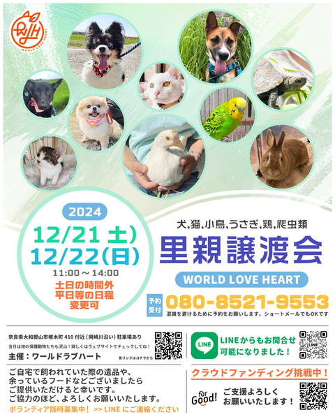 | イベント内容 | ワールドラブハートで里親募集中の動物たちの譲渡会を開催します! 犬猫だけではなく、インコやウサギ、チンチラに亀などたくさんの保護動物がいます! みんな新しい家族を探しています。写真だけでは伝えきれない魅力が盛りだくさん! 実際に会ってそのかわいさを実感してください♪ ★里親募集中の動物たち★ https://satoya-boshu.net/foster/?@button_name@=search&FosterParent_MemberID=1161 ★里親募集中の動物たち★ ・犬、猫 ・インコ ・ウサギ ・チンチラ ・ハムスター ・小鳥 ・チャボ ・カメ ……など 子犬や子猫もたくさんいますよ♡ ぜひお気軽にお越しください! ●混雑をさけるために、事前予約をお願いします。 予約番号080-8521-9553 ショートメールでも可♪ ●当日までに譲渡が決定した・体調がすぐれないなど、やむを得ない理由で不参加の場合があります。ご希望の子がいましたら、当日お問い合わせください。 ●当日、その場での引き渡しはしておりません。譲渡決定後、自宅訪問を兼ねてこちらからお届け致します。 ご来場お待ちしております♪ ★world love heart(ワールドラブハート)は、奈良県大和郡山市で活動している動物保護団体です。 『引き取り依頼は断らない』をモットーに、犬、猫、鶏、小動物、家畜、爬虫類など捨てられた動物を保護しています。 https://worldloveheart-nara.jimdofree.com |