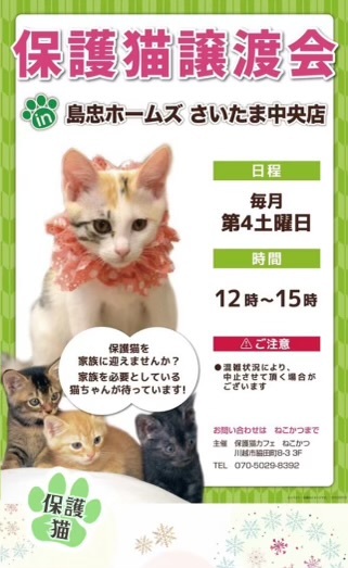 | イベント内容 | *保護猫讓渡会* 日時:12/28(土)12時~15時 場所:ホームズさいたま中央店さま 島忠ホームズさいたま中央店さま譲渡会に参加予定です。 センターからの引き出し、飼育崩壊や所有権放棄などで、生きる場所を失った猫たちが、最大限の医療にかけてピカピカになりました。 写真の猫の他にも甘えっこちゃんたちが、溢れる笑顔でお待ちしています。 ぜひご参加ください。 ***譲渡条件*** *完全室内でお願いします *逸走防止対策にご協力頂ける方 *写真付きの身分証をご提示頂ける方 *LINE若しくはメールでのやりとりが可能な方 *譲渡に関する覚え書きにご署名頂ける方 *初期医療費をご負担頂ける方 *その他の譲渡条件を、譲渡会場でお話させて頂ける方 *猫が生まれた年から20年後に、80歳を超えていない方 *お一人暮らしの方は、後見人さまのご同席が必要です |