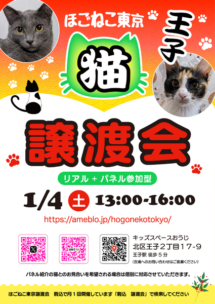 | イベント内容 | 猫好きさんがふらっと立ち寄れるアットホームな会です。今は不定期開催になりますが、継続して開催していきたいと思っています。お気軽に覗いてください。 月に一度、駒込で開催していますが、2025年は王子での開催もします。何匹かの可愛い猫が参加します。そしてまだご縁に恵まれない猫たちをパネル展示で紹介します。 リアルな譲渡会は子猫希望者が多く、大人猫の希望者はわずかです。保護猫は子猫だけではありません。私たちは大人猫にも幸せに暮らせるお家を見つけてあげたいのです。 近年、猫を展示する譲渡会だけではない、新しい形の譲渡会が増えています。私たちも様々な形で、譲渡活動を継続していきたいと思っています。初めての試みで準備不足や不手際があると思いますが、どうかご容赦ください。 応援よろしくお願いいたします。 ======= ほごねこ東京譲渡会in王子 1月4日(土) 13時〜16時00分 キッズスペースおうじ 北区王子2丁目17-9 王子駅 徒歩5分 ======= ●予約不要、入場無料です。 ●手指消毒のご協力をお願いいたします。 ●アンケート用紙にご記入ください。 ●お申し込みしたい猫が見つかりましたら、スタッフにお声がけください。生活環境や条件についてヒアリングさせていただきます。 ●お申し込みの際に、1匹1000円の運営協力金をお願いしております。トライアル(パネル参加の子はお見合い)が成立しない場合も返金はいたしません。 ●トライアル(パネル参加の子はお見合い)決定の有無は後日お電話かSMSにてお知らせいたします。再度ヒアリングさせていただく事がありますのでご了承ください。当日決定はしません。 ●参加予定の猫が欠席、または変更する場合があります。 ======= <基本譲渡条件> ・ペット可物件に居住 ・ご家族全員の同意と面談 ・完全室内飼育(ベランダ、庭、帰省先や旅行先への同伴不可) ・空調などによる室温管理 ・責任と愛情をもって終生飼育 ・適切な医療措置(先住猫についても同様) ・質の良いフードの継続 ・不妊手術の実施と報告 ・脱走や危険防止対策 ・清潔な環境とお部屋の整理整頓 ・全てのお部屋の出入りが自由(特別な場合を除く) ・一部の医療費と支援金のご負担 ・身分証明書を提示と契約書の取り交わし ・写真数枚や動画付きの定期報告 ======= ※お申し込みをお断りさせていただく可能性があるケース 保護主や、猫によって希望条件が異なりますので、あなたが保護猫を大切にできる方かどうか、熱意と誠意をお示しください。 ・一般的にご自身で終生飼育が難しい事が予想される方 (20年以上生きる長生きの子が増えています。最後までしっかりお世話する事ができるか、よくお考えください。子猫・幼猫希望は55歳位までを目安としておりますが、徒歩圏内に後見人がいるなど、条件次第で変わります。) ・子猫・幼猫希望でお留守番時間が長い方(お子様や高齢者のみのお留守番は不可です。) ・脱走防止など、安全対策に全面協力していただけない ・自動製品に頼りすぎなど、毎日の健康管理を怠っている ・安定収入(経済力)がない方 ・未成年、単身の方、妊娠中の方、高齢の方 ・個々が経済的に自立していない同棲カップル ・お部屋が狭い、猫が走り回れるスペースを確保できない(譲渡目安:1LDK〜、約40平米〜。猫により狭いお部屋でも可能な場合があります。) ・先住犬、ハイシニアの先住猫がいる ・喫煙者多数、動物に配慮しない喫煙者がいる ・ご家族お揃いで面談ができない(特別な場合を除く) ・お引っ越し予定がある など |