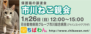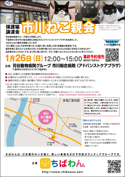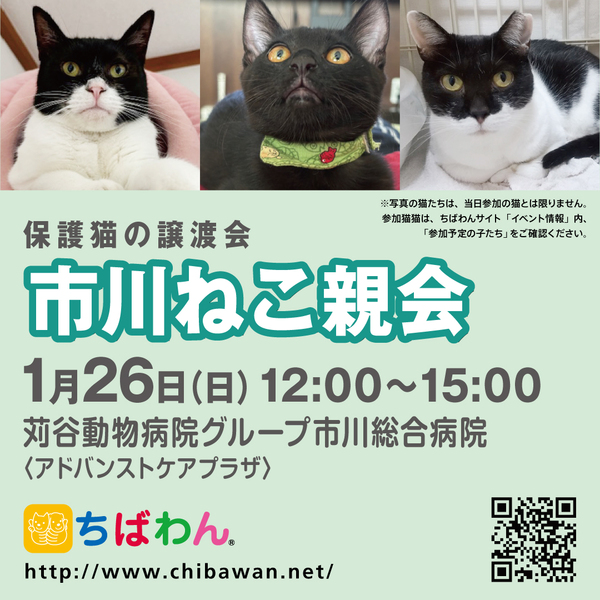 | イベント内容 | 苅谷動物病院様のご厚意により、千葉県市川市の市川総合病院にに併設された<アドバンストケアプラザ>をお借りして、「ちばわんねこ親会」を開催いたします。 是非カワイイねこたちに会いに来てください♪ ※ポスターの猫が参加するとは限りません。参加猫に関してはHPのイベント情報をご覧ください。 ※会場への直接のお問い合わせはご遠慮ください。 開催日 2025年01月26日(日)12:00〜15:00 場所 苅谷動物病院グループ 市川総合病院 <アドバンストケアプラザ> 〒272-0034 千葉県市川市市川2-6-14 アクセス JR総武線・総武快速線 市川駅より約徒歩7分 京成線 国府台駅より約徒歩8分 ※ねこ親会にご来場される方は市川橋病院の駐車場は利用できません。 車でお越しの際は、付近のコインパーキングをご利用ください。 路上駐車は絶対にお止めください。 駅からも近い場所ですので電車・バスなどの公共の交通機関の利用をお勧めいたします。 注意事項 室内での開催ですが、当日荒天の場合は中止いたします。 微妙なお天気、または中止の場合は朝8時までにこちらでお知らせいたします。 なお、当日に個別でのメール連絡はできかねます。 【会場内でのお願い】 ・当日、会場内への犬猫等の愛玩動物の同伴は出来ません。 ・会場内は<土足不可>です。スリッパなど室内履きをご持参いただきますようお願い致します。 ・譲渡が決定した場合、後日猫をご自宅へお届けいたします。当日猫をお引渡しすることはございません。 【当日の流れ】 ①家族募集中のねこと会いたい方はどなたでも自由にご参加いただくことができます。ちばわんボランティアは名札をつけておりますのでどうぞご遠慮なくお声をおかけください。 また、募集中のねこのそばには預かりボランティアが控えておりますので遠慮なくご質問ください。 ②気に入ったねこがいましたら、該当の預かりボランティアとお話しのうえ、「申し込みアンケート」にご記入ください。 (前日までにメールでアンケートを送信してお申し込みいただくこともできます) ◆「ねこ」アンケート送信先:【ねこ親】お申込みアンケート ③アンケート内容を拝見し、アンケート担当者がお話しさせていただきます。 ④原則として一両日中に預かりボランティアからお返事の連絡をさせていただきます。 ⑤ご縁が成立した場合は後日、こちらからご自宅までねこをお届けし、約1ヶ月のお試し生活に入っていただきます。 お届けの際に書面での譲渡契約書を交わします。 ※ワクチン・去勢不妊手術・マイクロチップなど保護ねこにかかった費用は家族になるねこ親様にもご負担をお願いしています。 |